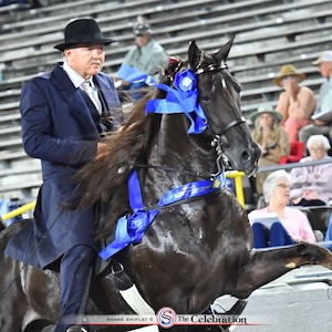 Class 95 brought the young riders back into the ring with Owner-Amateur Youth 6-14 on Ponies. Judge Sisk called the class once the seven entries were in the ring. The young riders held nothing back as they kicked their horses up into a flat walk and strode around the ring. The competition was fierce. This time, the world championship went to I Am March Madness and Ryder Wright riding for himself and Debbie Woods. I Am March Madness adds this to wins at the WHTA National Trainers’ Show and his Three-Year-Old Stallions World Championship from 2022. Second out of the lineup was Duracell CF and John Winston Clark, the owner and up, of Arab, Alabama. They have had a year of wins at Christmas In July and the Red Carpet Show Of The South. This was Duracell CF’s first year showing at The Celebration. Third place in the good class was awarded to the 2023 and 2024 champion in the class, The Ultimate Honor and Jack Harney for The Justin Harney Family.