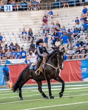 This past weekend, Sweet Walking Matilda and Ally Jo Jacobs stepped into a whole new kind of spotlight. Fresh off their Owner-Amateur Youth 6–17 Trail Pleasure World Grand Championship win, the duo had the honor of delivering the game ball to kick off Middle Tennessee State University’s Homecoming football game in Murfreesboro, Tennessee.